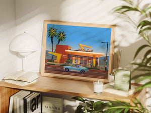 No, every piece is created digitally by hand. I spend a long time researching Los Angeles architecture and history, then carefully draw each illustration in Photoshop. It’s a process rooted in passion, not automation.