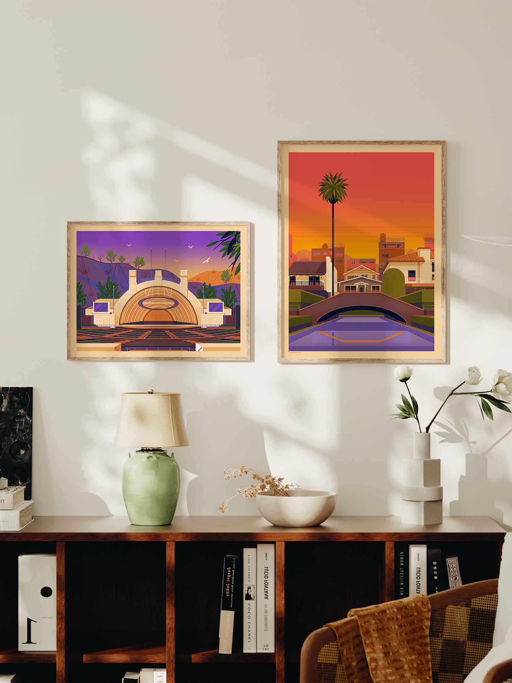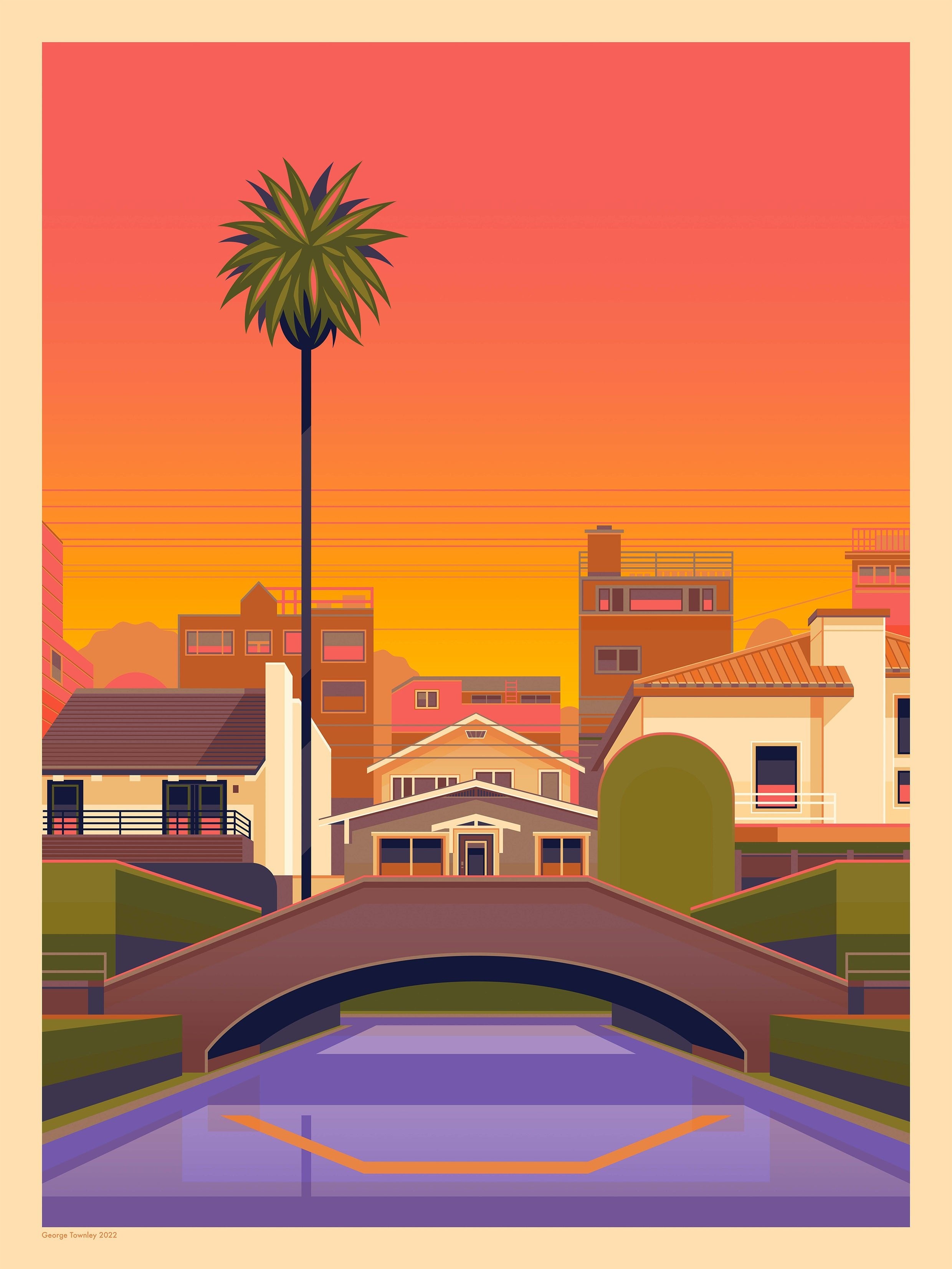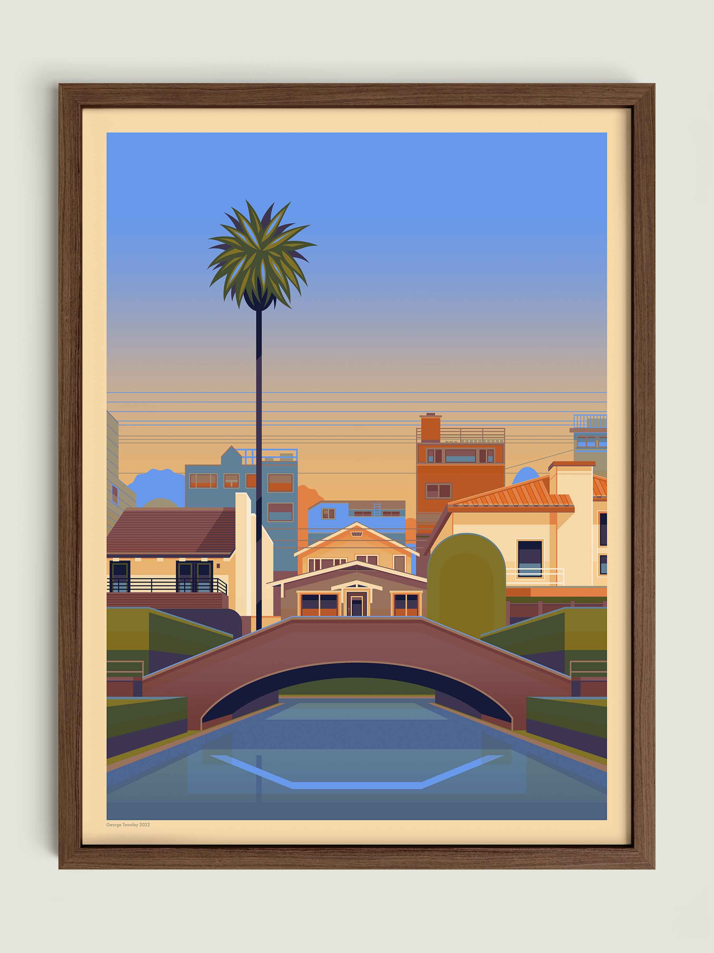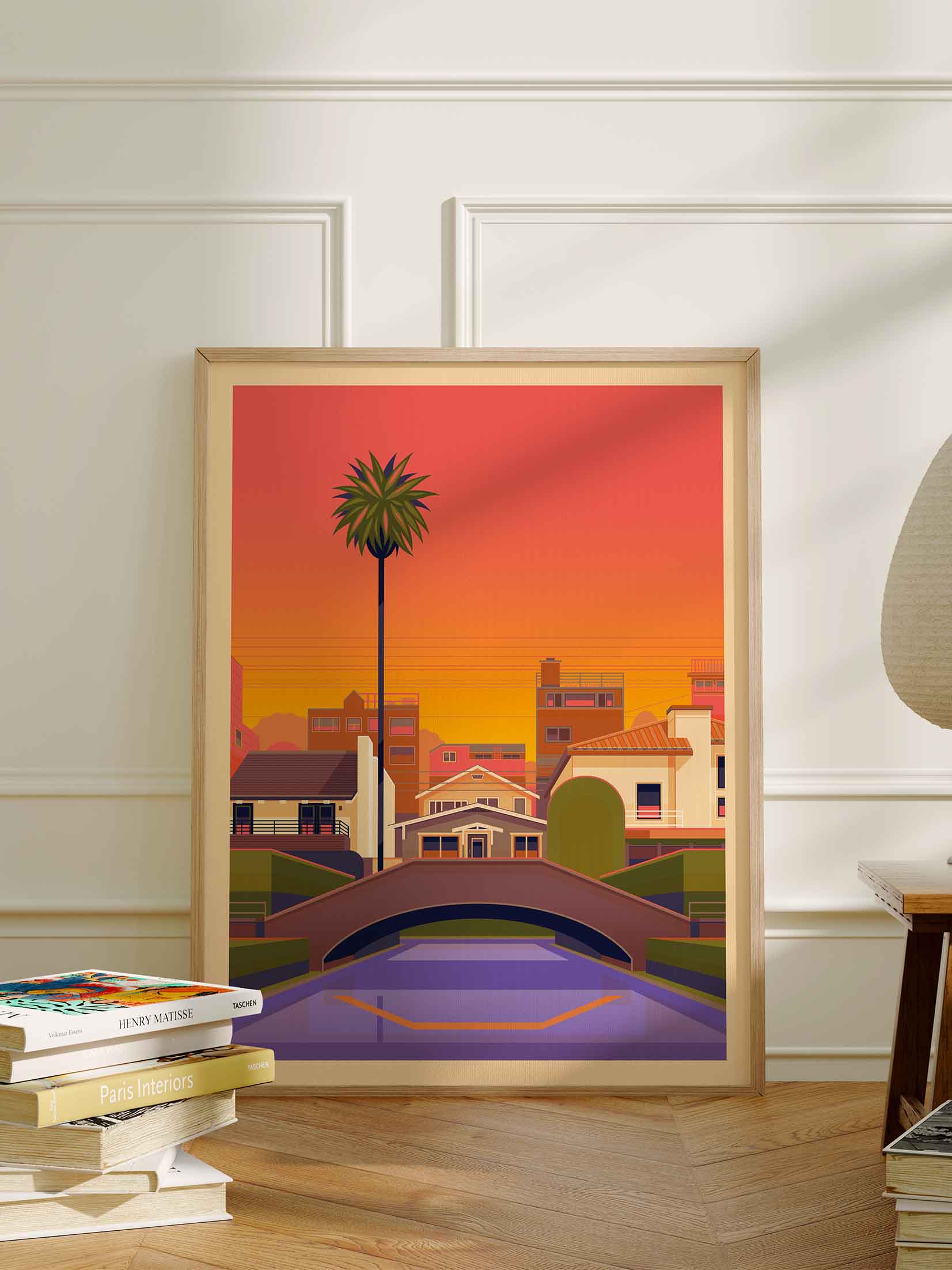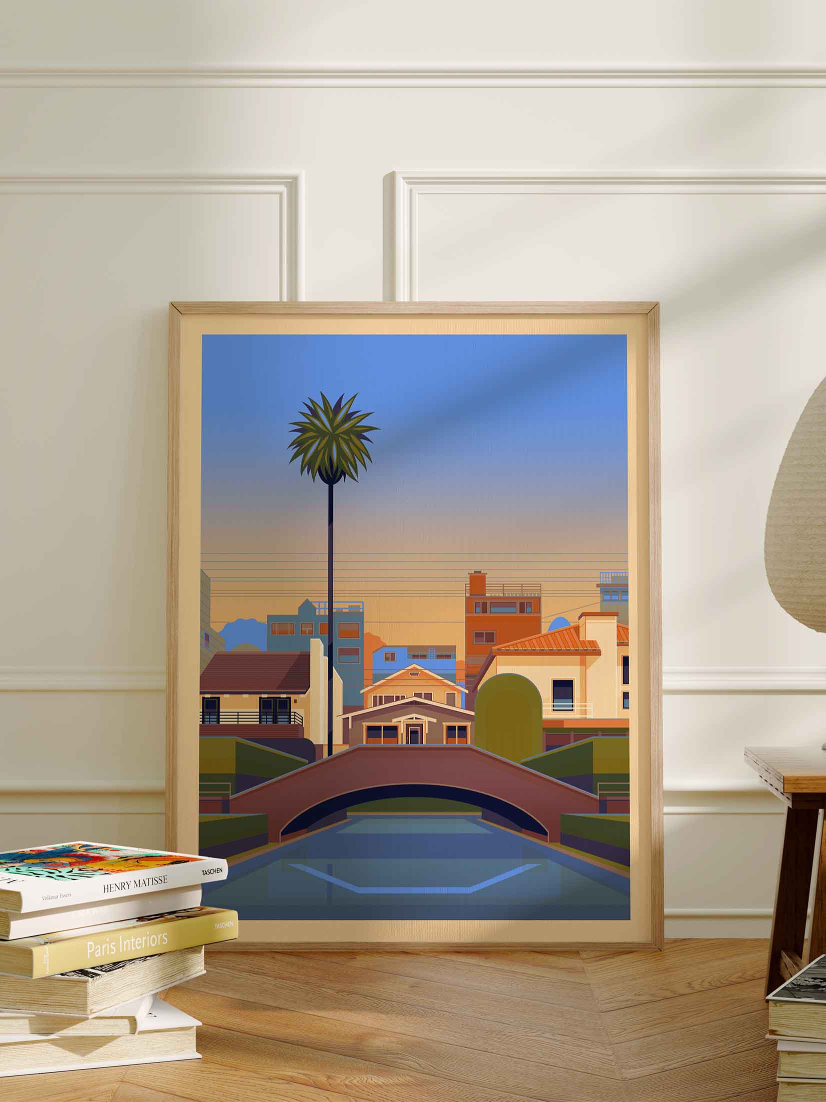 For this print, I spent hours trying to capture the perfect shot, taking pictures from every bridge and loving how each view revealed a different arrangement of houses. The quiet rhythm of the canals makes it feel like a serene escape from the city, yet somehow you’re still right in the heart of Los Angeles.
