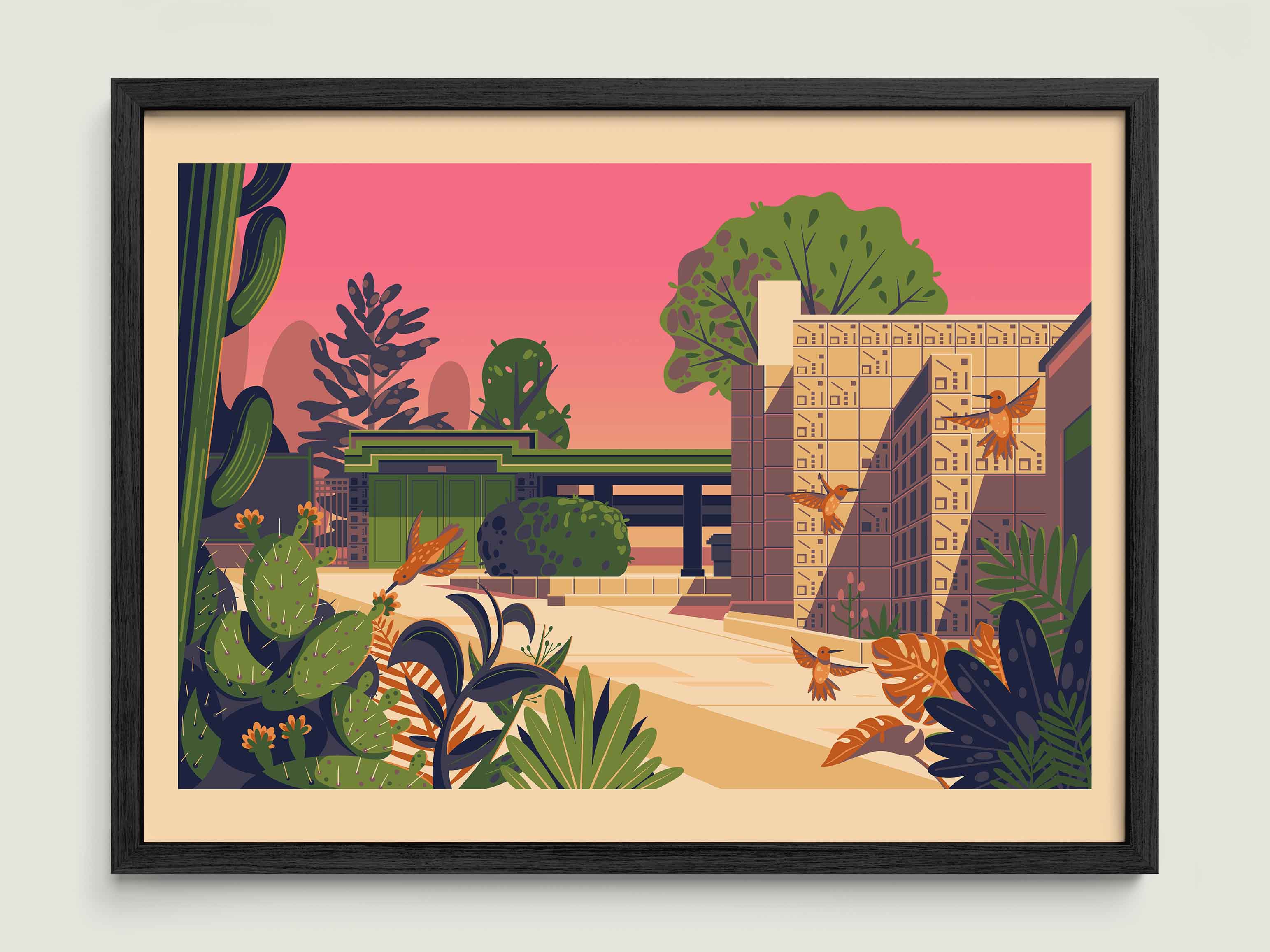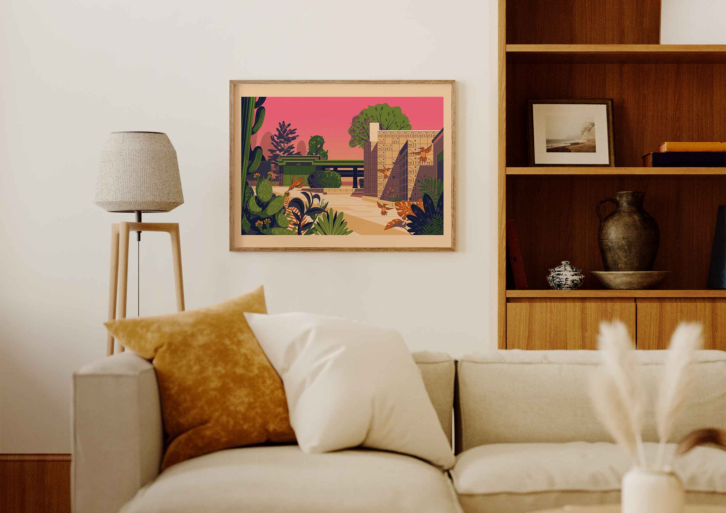 This print is of the Samuel Freeman House, a lesser-known hidden gem in LA designed by Frank Lloyd Wright. Built in 1924, it’s an early example of Wright’s textile block style, where patterned concrete blocks form both structure and decoration. I love how it blends seamlessly into the nature around it while still feeling strikingly modern for its time.