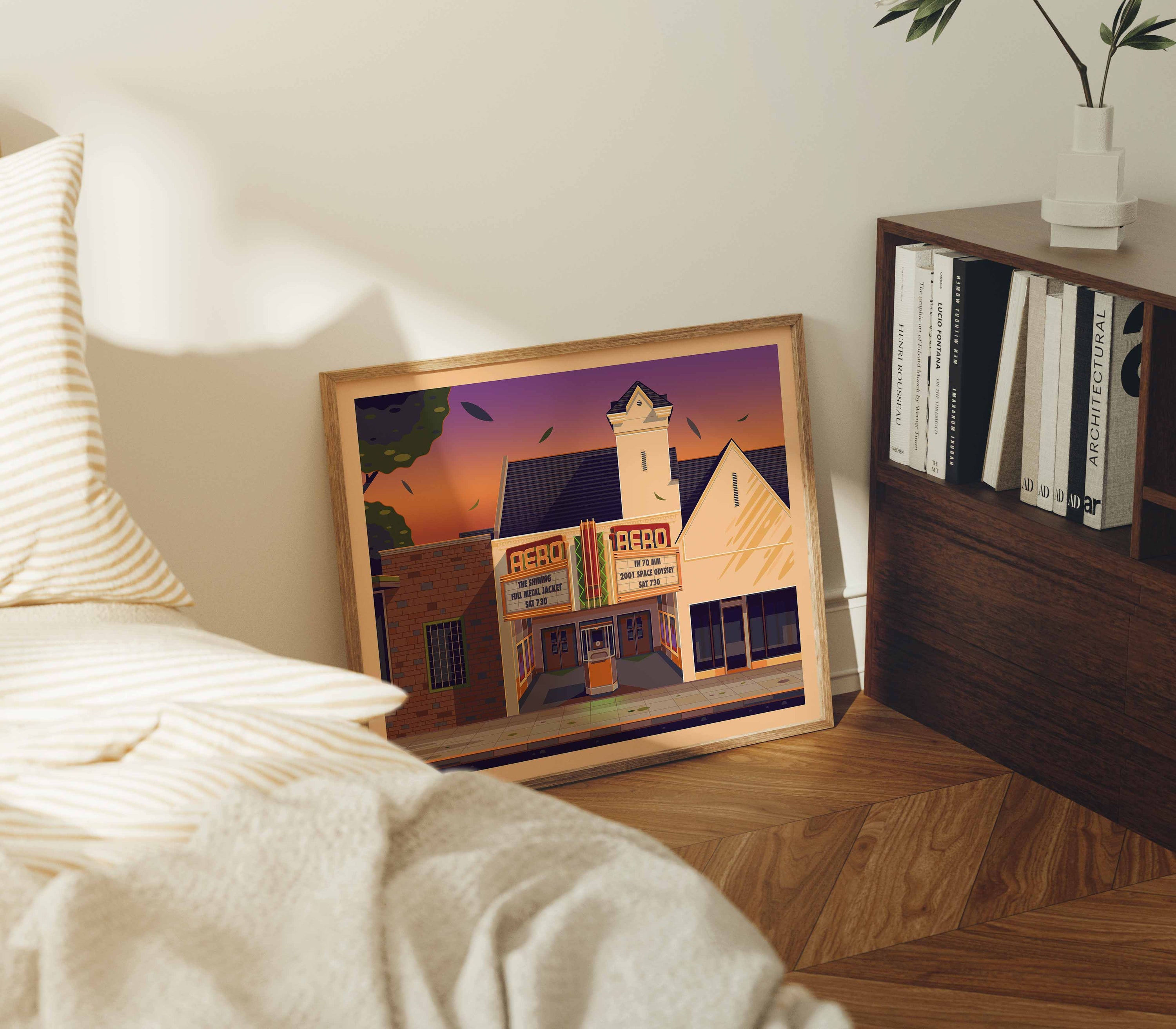 My tribute to the Aero Theatre, an iconic movie theatre in Los Angeles. This artwork captures the city’s unique blend of architecture and nostalgia in a fine art print.